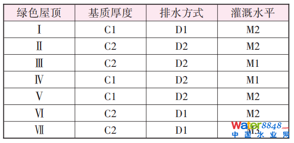 大型綠色屋頂實(shí)驗(yàn)區(qū)設(shè)有5個(gè)綠色屋頂(分別是Ⅰ、Ⅱ、Ⅲ、Ⅳ、Ⅴ)和混凝土屋頂Ⅵ,大型綠色屋頂實(shí)驗(yàn)區(qū)建設(shè)方案見表3。