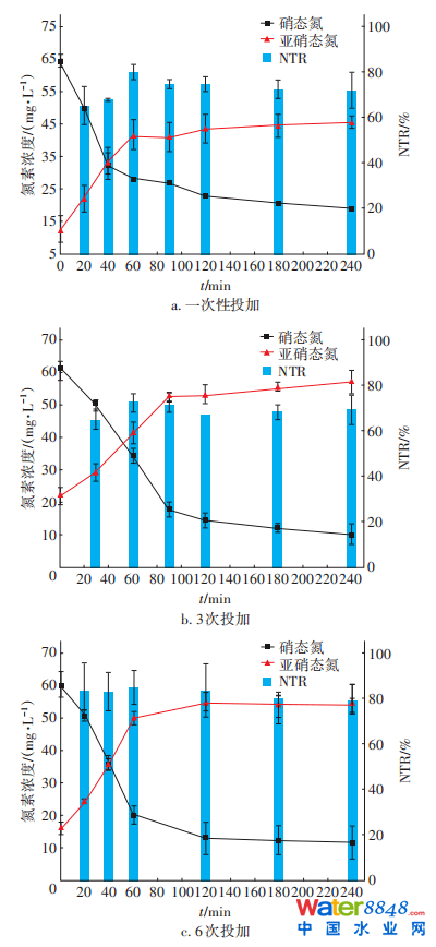 此外,3種投加條件下SBR反應器出水NO 3--N、NO2--N濃度及NTR變化趨勢基本相似。在反應前期,反應器出水NO3--N濃度隨著反應的進行而逐漸降低,NO2--N濃度不斷積累升高。這是因為在反應初期,硝酸鹽還原菌的底物NO3--N和碳源充足,硝酸鹽還原酶可結(jié)合的電子供體與受體增加,NO3--N可快速轉(zhuǎn)化為NO2--N。反應一段時間后,反應器中NO3--N、NO2--N濃度變化不大,是因為反應后期NO3--N和碳源濃度較低,反應變慢,NO3--N和NO2--N變化不明顯,因此二者濃度及NTR比較穩(wěn)定。有研究表明,當C/N值大于3(超過了完全反硝化所需要的碳源量)時出水NO 2--N濃度隨反應的進行而先增加后減少。而本實驗中C/N值為2,且通過分次投加降低了反應期間碳源濃度,使反應器中不明顯發(fā)生完全反硝化,才成功在反應后期穩(wěn)定積累NO2--N濃度。3種碳源投加方式下,反應器中的NTR呈微弱的先上升后下降的趨勢,且均在60min時達到最大值。經(jīng)比較可知,6次投加方式下反應器出水NO2--N濃度和NTR都達到最高水平。