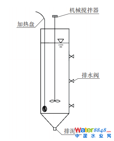 實驗裝置采用SBR反應器,由有機玻璃制成,有效體積為3L,長為11cm,寬為11cm,高為40cm,見圖1。在反應器上方安裝JJ-1型懸臂式攪拌器,攪拌速度為200r/min,以保持反應過程中的完全混合且溶解氧不超過0.2mg/L。使用哈希HQ30d溶解氧儀測定溶解氧,雷弗BT100L型蠕動泵控制進水和碳源投加,德力西2W040-10型電磁閥進行排水。使用YX25L型溫控加熱盤控制反應器內(nèi)溫度在24~25 ℃。