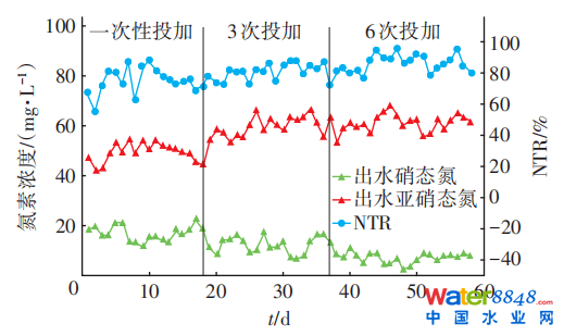 不同碳源投加方式對PD系統(tǒng)氮素轉(zhuǎn)化特性的影響如圖3所示。進水NO 3--N為100mg/L,一次性投加時,反應器出水NO3--N、NO2--N平均濃度分別為17.18、49.24mg/L,NTR平均為75.10%、最大達到88.62%。前10d反應器中NTR稍有波動,后趨于穩(wěn)定。3次投加方式條件下,反應器出水NO3--N、NO2--N平均濃度分別為12.28、58.9mg/L,NTR平均為81.55%,比一次性投加時高6.45%,NTR最大為88.72%,與一次性投加時相差不大,說明3次投加時反應器出水NTR波動不大。6次投加方式條件下,反應器出水NO3--N、NO2--N平均濃度分別為7.33、60.92mg/L,NTR平均為86.55%、最高可達96.14%。