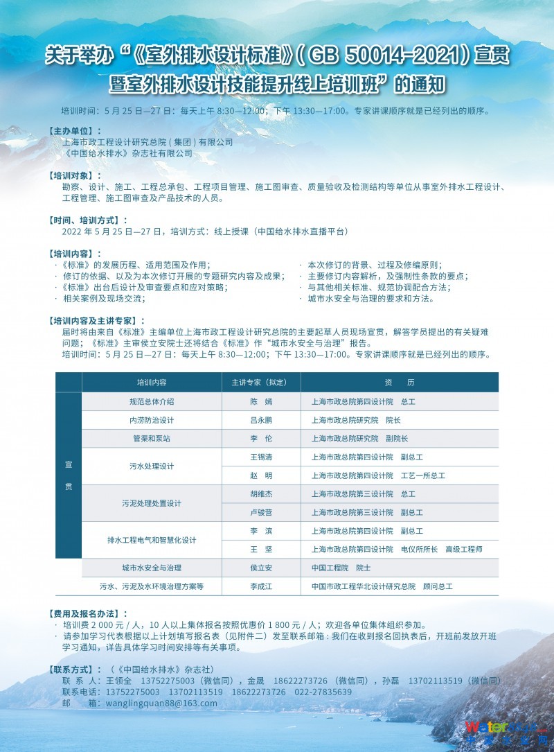 中國(guó)水協(xié)團(tuán)體標(biāo)準(zhǔn)《城鎮(zhèn)污水處理廠碳減排評(píng)估標(biāo)準(zhǔn)》宣貫會(huì)通知  報(bào)告人:王秀蘅 哈爾濱工業(yè)大學(xué)教授  博士生導(dǎo)師直播時(shí)間:2024年7月17(周三)14:00-16:00 2024-07-17 14:0 蘇伊士 程忠紅 :反硝化濾池在污水脫氮中的差異化應(yīng)用 直播時(shí)間:2024年7月2日(周二)14:00—16:00 2024-07-02 14:00:00 開(kāi)始