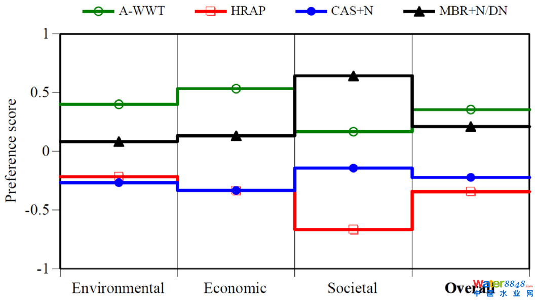 由圖2所示,在環(huán)境可持續(xù)性方面,上述四種污水處理技術(shù)按照A-WWT(0.4)、MBR(0.08)、HRAP(-0.22)和CAS(-0.27)的順序從最好到最差。在經(jīng)濟(jì)可持續(xù)性的背景下,A-WWT和MBR技術(shù)獲得了正的偏好分?jǐn)?shù),且A-WWT系統(tǒng)的排名優(yōu)于MBR系統(tǒng)。而HRAP和CAS系統(tǒng)的偏好分?jǐn)?shù)為負(fù),且HRAP優(yōu)于CAS。在社會可持續(xù)性方面,MBR、A-WWT、CAS、HRAP分別得分0.64、0.17、-0.14和-0.67,排名順序從最好到最差?紤]整體可持續(xù)性,四種處理技術(shù)由最好到最差分別為A-WWT、MBR、CAS和HRAP。