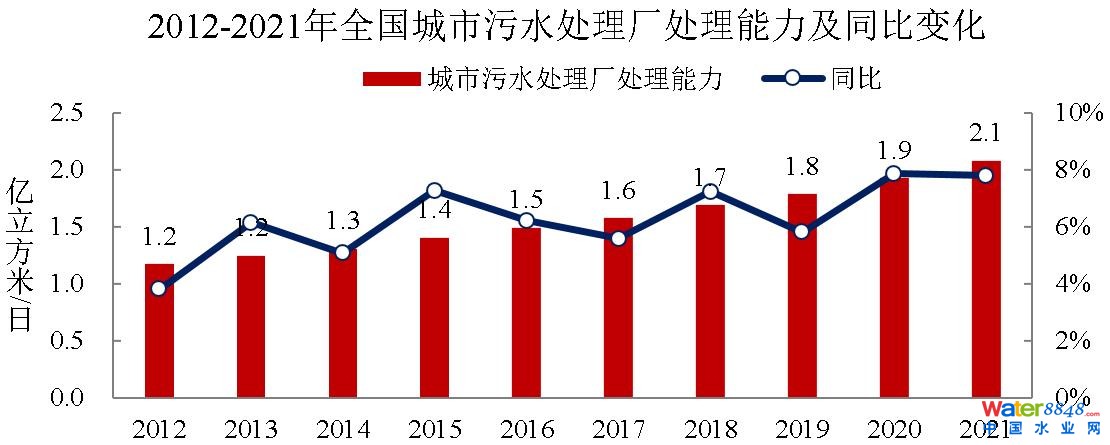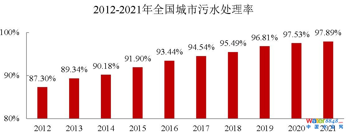 2021年年末,全國城市排水管道總長度87.2萬公里,同比增長8.7%;污水處理廠處理能力2.1億立方米/日,同比增長7.8%。2021年,污水處理率97.89%,比上年增加0.36個百分點;城市生活污水集中收集率68.6%,比上年增加3.8個百分點。