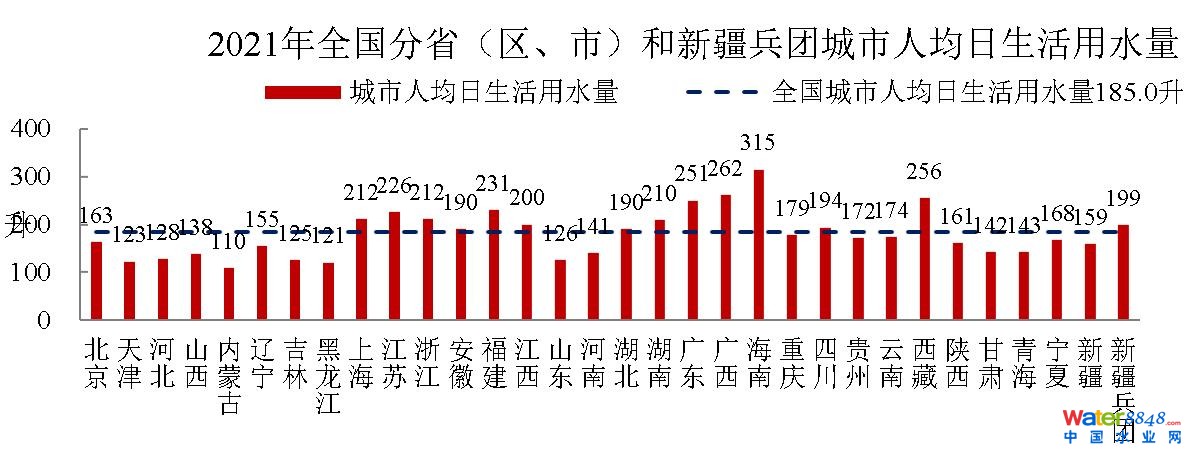 從行政分區(qū)看,海南省城市人均日生活用水量超過300升,廣西、西藏、廣東、福建、江蘇、浙江、上海、湖南和江西9個省(區(qū)、市)超過200升(含);四川、湖北、安徽、重慶、云南、貴州、寧夏、北京、陜西、新疆、遼寧11個。▍^(qū)、市)和新疆兵團超過150升;青海、甘肅、河南、山西、河北、山東、吉林、天津、黑龍江和內(nèi)蒙古10個。▍^(qū)、市)超過100升。