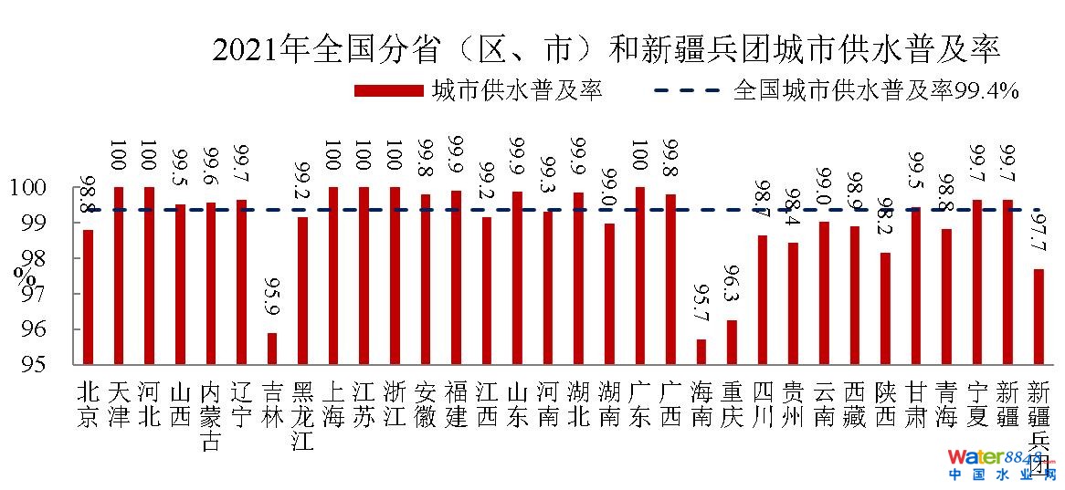 2021年,全國城市供水總量673.34億立方米,同比增長6.96%;城市供水管道長度105.99萬公里,同比增長5.26%;人均日生活用水量185.03升;供水普及率99.38%,比上年增加0.39個百分點。