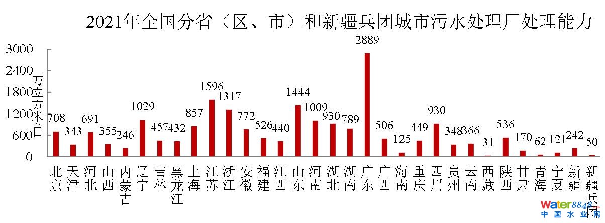 從行政分區(qū)看,廣東、江蘇、山東、浙江、遼寧和河南6個省份城市污水處理廠處理能力超過1000萬立方米/日;湖北、四川、上海、湖南、安徽、北京、河北、陜西、福建和廣西10個。▍^(qū)、市)在500-1000萬立方米/日之間;吉林、重慶、江西、黑龍江、云南、山西、貴州、天津、內(nèi)蒙古、新疆、甘肅、海南、寧夏13個省(區(qū)、市)在100-500萬立方米/日之間;青海、西藏和新疆兵團不足100萬立方米/日。