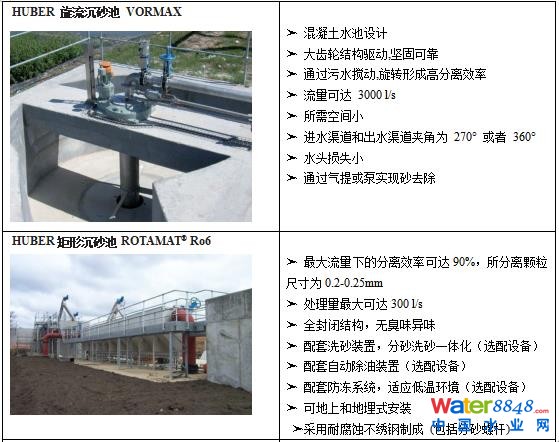 凈水廠預(yù)處理工藝中預(yù)沉池常用的有沉砂、沉淀、澄清等。原水中懸浮物多為砂性大顆粒時(shí)應(yīng)采用沉砂池。常用的沉砂池有旋流絮凝沉砂池、平流沉砂池、輻流式沉砂池和斜管沉砂池。漢斯琥珀®對(duì)應(yīng)的產(chǎn)品有Huber旋流沉砂池VORMAX、Huber矩形沉砂池Ro6、Huber圓形沉砂池HRSF、Huber高效沉砂池GritWolf®。后續(xù)的砂水分離、洗砂和脫水,可采用Huber砂水分離器RoSF3和Huber一體化洗砂器RoSF4。