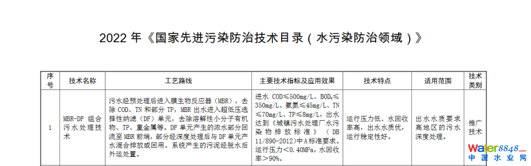 生態(tài)環(huán)境部正式印發(fā)2022年《國家先進(jìn)污染防治技術(shù)目錄(水污染防治領(lǐng)域)》,碧水源自主知識(shí)產(chǎn)權(quán)的“MBR-DF組合污水處理技術(shù)”作為推廣技術(shù)入選