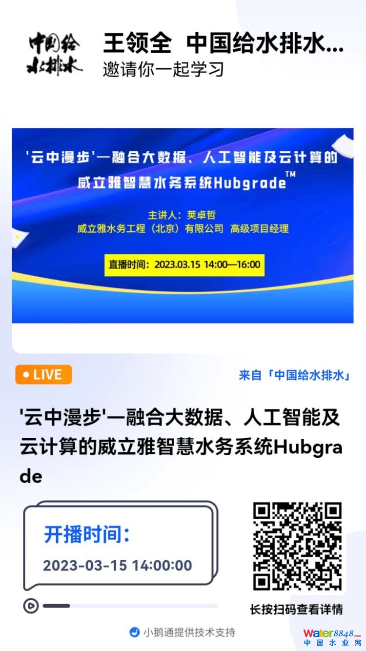 中國(guó)給水排水直播:云中漫步-融合大數(shù)據(jù)、人工智能及云計(jì)算的威立雅智慧水務(wù)系統(tǒng)Hubgrade 直播時(shí)間:2023年3月15日 中國(guó)給水排水直播平臺(tái)會(huì)議通知 | 2023污泥處理處置技術(shù)與應(yīng)用高峰論壇(清華大學(xué)王凱軍教授團(tuán)隊(duì)等)