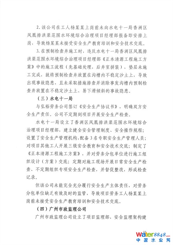 調(diào)查顯示,事故項(xiàng)目為珠海市香洲區(qū)鳳凰排洪渠范圍水環(huán)境綜合治理項(xiàng)目。涉事工程的施工單位為中國(guó)水利水電第十一工程局有限公司,項(xiàng)目經(jīng)理為寧某某。勞務(wù)分包單位為深圳市弘裕建筑勞務(wù)有限公司。監(jiān)理單位為廣州市市政工程監(jiān)理有限公司。