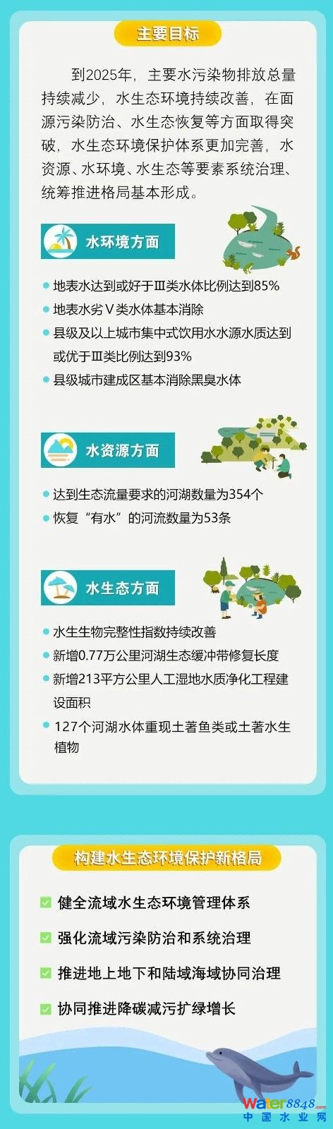 《規(guī)劃》提出到2025年,主要水污染物排放總量持續(xù)減少,水生態(tài)環(huán)境持續(xù)改善,在面源污染防治、水生態(tài)恢復(fù)等方面取得突破,水生態(tài)環(huán)境保護(hù)體系更加完善,水資源、水環(huán)境、水生態(tài)等要素系統(tǒng)治理、統(tǒng)籌推進(jìn)格局基本形成。展望2035年,水生態(tài)環(huán)境根本好轉(zhuǎn),生態(tài)系統(tǒng)實(shí)現(xiàn)良性循環(huán),美麗中國(guó)水生態(tài)環(huán)境目標(biāo)基本實(shí)現(xiàn)。