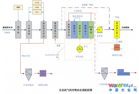 該項(xiàng)目為EPC(Engineering Procurement Construction)形式,綠諾公司負(fù)責(zé)除土建、鋼結(jié)構(gòu)以外的供貨、安裝、調(diào)試、性能試驗(yàn)、培訓(xùn)等所有工作。項(xiàng)目規(guī)模為預(yù)處理及生化總處理水量150m3/h,高級(jí)催化氧化系統(tǒng)70m3/h。項(xiàng)目實(shí)施階段發(fā)生了一些調(diào)整,其中生化系統(tǒng)分為了兩期,只實(shí)施了一期75m3/h。在項(xiàng)目運(yùn)行后,運(yùn)行水量在105 m3/h左右,所以實(shí)際運(yùn)行工藝與原設(shè)計(jì)工藝有比較大的區(qū)別,污水沒有經(jīng)過生化和臭氧高級(jí)氧化的連續(xù)串聯(lián)處理,而是在經(jīng)過預(yù)處理后分為兩個(gè)并聯(lián)的處理流程,即75m3/h生化處理后回用,其余30m3/h經(jīng)高級(jí)氧化后排放。