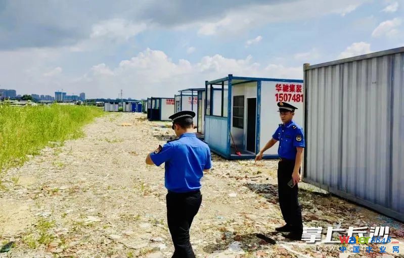 大片耕地被建筑固態(tài)垃圾填平,還建起集裝箱簡易房,城管執(zhí)法人員及時保全證據(jù),控制損害。均為長沙晚報通訊員 高文 供圖