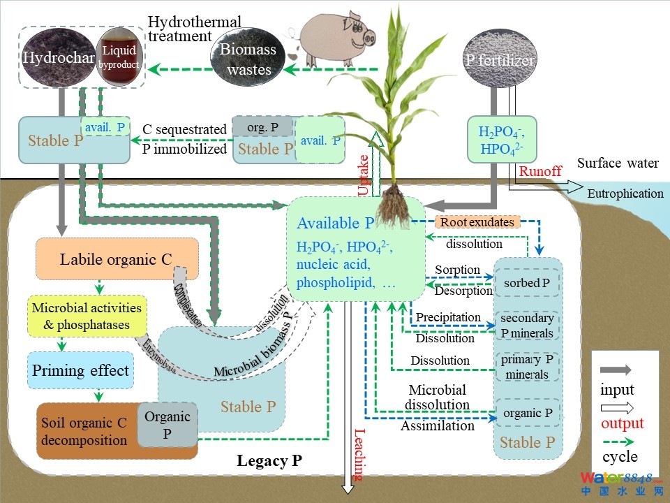 遺留磷是過量施肥而在土壤中盈余累積的磷,提高遺留磷利用效率是緩解當前磷資源短缺同時保障糧食安全的最重要途徑。水熱炭化作為有機固廢資源化重要的負碳技術,處理過程可將有機固廢中作物難以利用的有機磷轉(zhuǎn)化為無機磷;水熱炭富含的活性有機碳,可通過絡合金屬陽離子、競爭吸附位點抑制磷在土壤界面吸附等作用釋放土壤固定的磷;同時,水熱炭可通過提升土壤微生物種群和磷酸酶活性,觸發(fā)激發(fā)效應和酶促反應,促進土壤中與有機碳結(jié)合的有機磷的礦化分解,提高土壤遺留磷(酶解)活化和生物有效性;诖,我們提出水熱炭有望在提高土壤遺留磷的有效性和利用效率、實現(xiàn)土壤遺留磷和有機固廢高效循環(huán)利用等方面的發(fā)揮重要作用(圖3)。