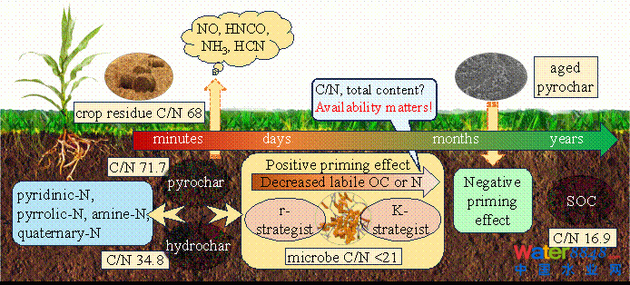 綜述論文首先厘清了生物炭(biochar)(熱解炭(pyrochar)和水熱炭(hydrochar))的定義內(nèi)涵;系統(tǒng)比較了熱解炭、水熱炭在土壤環(huán)境不同穩(wěn)定性及主控因素;詳細探討了熱解炭和水熱炭誘導土壤有機碳分解的激發(fā)效應作用機制等關鍵問題。首次提出土壤環(huán)境中有效態(tài)C/N化學計量比是影響生物炭穩(wěn)定性和有機碳在土壤環(huán)境轉(zhuǎn)化的關鍵因素的觀點(圖2);全面闡述了生物炭中氮形態(tài)轉(zhuǎn)化對土壤生態(tài)系統(tǒng)溫室氣體排放的重要貢獻;通過對生物炭在土壤應用閾值、經(jīng)濟成本等方面限制生物炭在土壤固碳應用因素的分析,建議開展應用生命周期評價方法指導生物炭的固碳應用、降低其環(huán)境風險的相關研究。