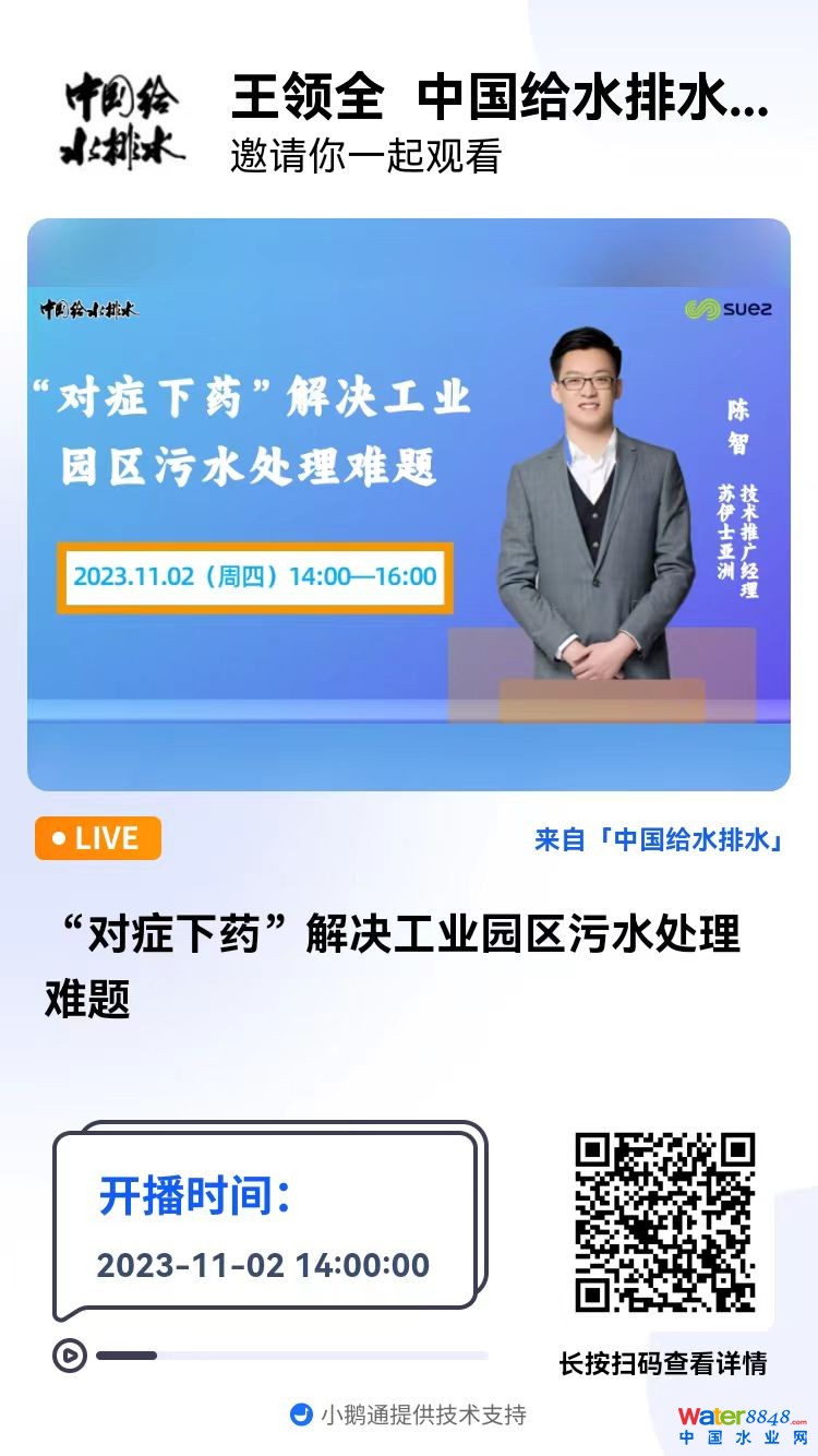 直播主題:“對癥下藥”解決工業(yè)園區(qū)污水處理難題 報告人:陳智 蘇伊士亞洲 技術(shù)推廣經(jīng)理 直播時間:2023年11月2日(周四)14:00—16:00 2023-11-02 14:00:00 開始