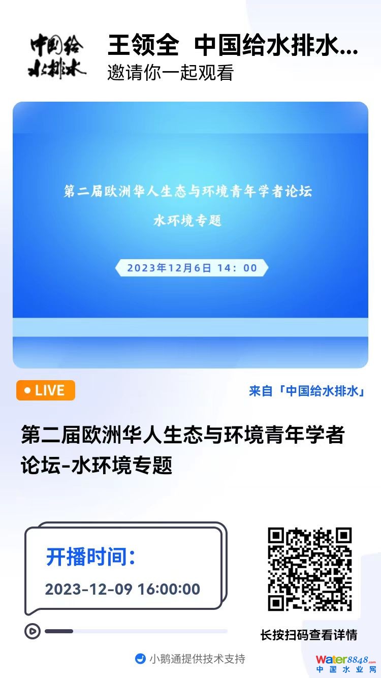 中國城鎮(zhèn)供水排水協(xié)會城鎮(zhèn)水環(huán)境專業(yè)委員會2023年年會暨換屆大會 直播時間:2023年12月16日(周六)08:30—18:00 2023-12-16 08:30:00 開始 第二屆歐洲華人生態(tài)與環(huán)境青年學(xué)者論壇-水環(huán)境專題 直播時間:2023年12月9日(周六)16:00—24:00 2023-12-09 16:00:00 開始