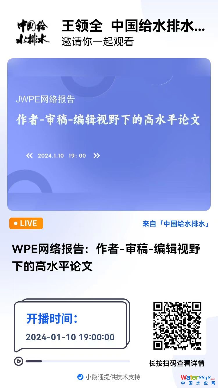 WPE網(wǎng)絡(luò)報(bào)告:作者-審稿-編輯視野下的高水平論文 直播時(shí)間:2024年1月10日(星期三)19:00 2024-01-10 19:00:00 開始 核心期刊:中國給水排水》繼續(xù)入編北大《中文核心期刊要目總覽》 中國給水排水核心科技期刊