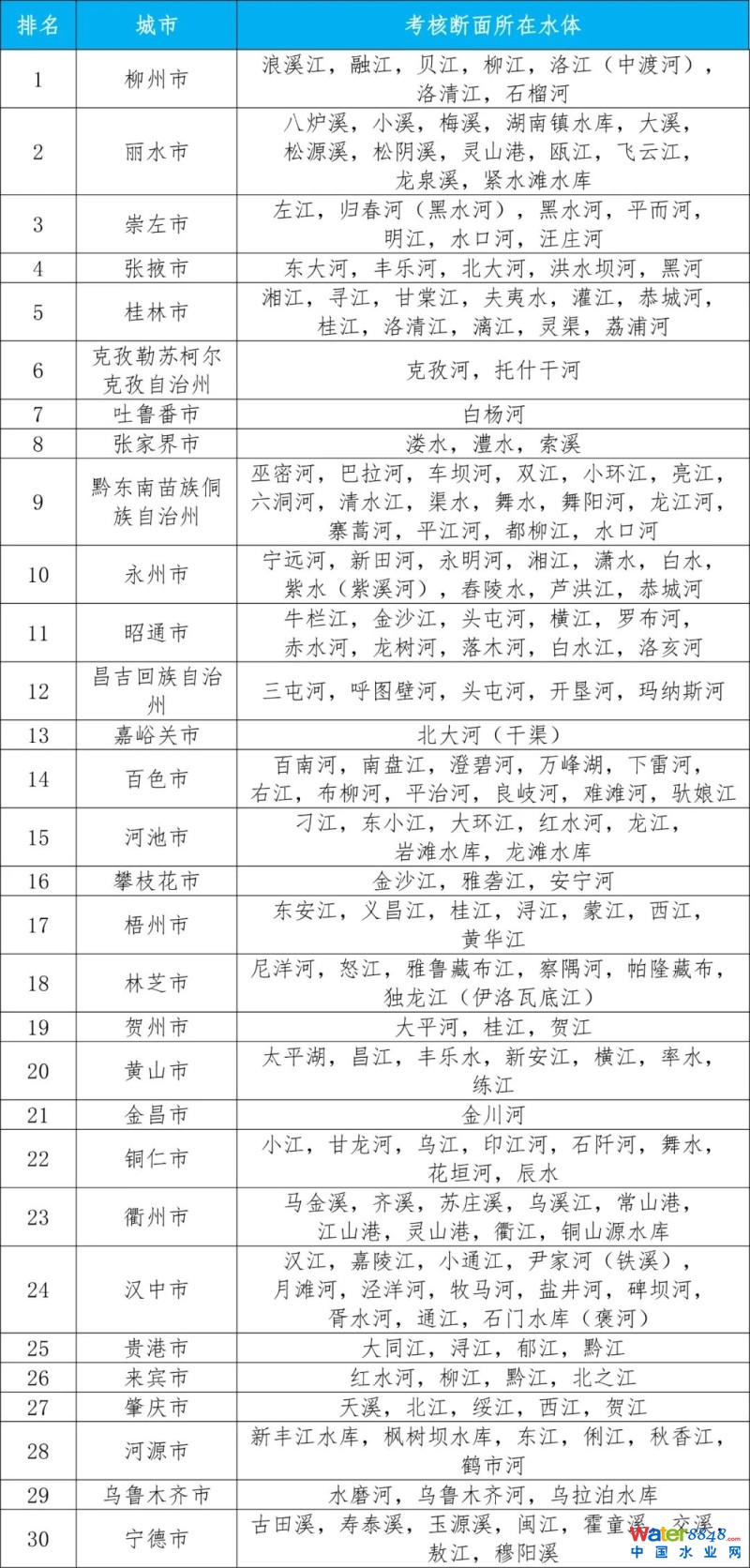 1—12月,全國地級(jí)及以上城市中,柳州市、麗水市和崇左市等30個(gè)城市國家地表水考核斷面水環(huán)境質(zhì)量相對(duì)較好(從第1名至第30名),五家渠市、商丘市和開封市等30個(gè)城市國家地表水考核斷面水環(huán)境質(zhì)量相對(duì)較差(從倒數(shù)第1名至倒數(shù)第30名),見附表1—2。