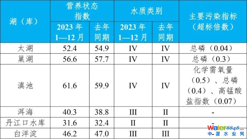 第四季度,監(jiān)測(cè)的208個(gè)重點(diǎn)湖(庫)中,水質(zhì)優(yōu)良(Ⅰ—Ⅲ類)湖庫個(gè)數(shù)占比76.4%,同比上升2.8個(gè)百分點(diǎn);劣Ⅴ類水質(zhì)湖庫個(gè)數(shù)占比3.8%,同比下降1.0個(gè)百分點(diǎn)。主要污染指標(biāo)為總磷、化學(xué)需氧量和高錳酸鹽指數(shù)。201個(gè)監(jiān)測(cè)營養(yǎng)狀態(tài)的湖(庫)中,中度富營養(yǎng)的9個(gè),占4.5%;輕度富營養(yǎng)的46個(gè),占22.9%;其余湖(庫)為中營養(yǎng)或貧營養(yǎng)狀態(tài)。其中,太湖和巢湖均為輕度污染、輕度富營養(yǎng),主要污染指標(biāo)為總磷;滇池為中度污染、中度富營養(yǎng),主要污染指標(biāo)為化學(xué)需氧量、總磷和高錳酸鹽指數(shù);洱海和白洋淀均水質(zhì)良好、中營養(yǎng);丹江口水庫水質(zhì)為優(yōu)、中營養(yǎng)。
