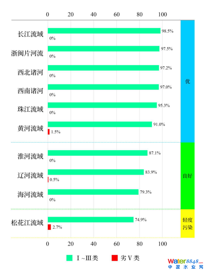 1—12月,長江、黃河、珠江、松花江、淮河、海河、遼河等七大流域及西北諸河、西南諸河和浙閩片河流水質(zhì)優(yōu)良(Ⅰ—Ⅲ類)斷面比例為91.7%,同比上升1.5個(gè)百分點(diǎn);劣Ⅴ類斷面比例為0.4%,同比持平。主要污染指標(biāo)為化學(xué)需氧量、高錳酸鹽指數(shù)和五日生化需氧量。其中,長江流域、浙閩片河流、西北諸河、西南諸河、珠江和黃河流域水質(zhì)為優(yōu);淮河、遼河和海河流域水質(zhì)良好;松花江流域?yàn)檩p度污染。