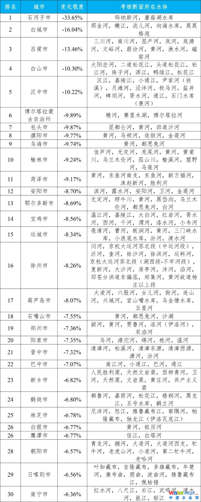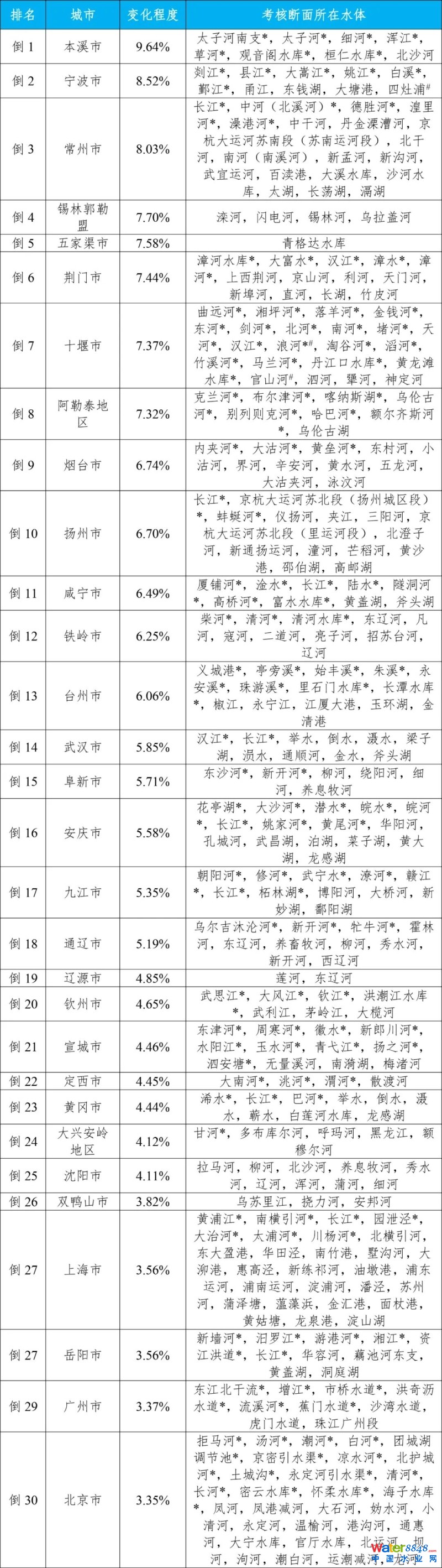 石河子市、白城市和呂梁市等30個(gè)城市國家地表水考核斷面水環(huán)境質(zhì)量變化情況相對(duì)較好(從第1名至第30名),本溪市、寧波市和常州市等30個(gè)城市國家地表水考核斷面水環(huán)境質(zhì)量變化情況相對(duì)較差(從倒數(shù)第1名至倒數(shù)第30名)。見附表3—4。