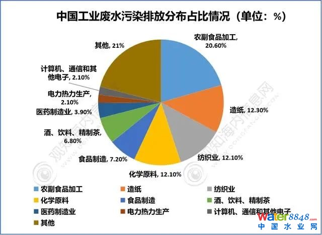 從我國工業(yè)廢水污染物排放分布情況來看,農(nóng)副食品加工業(yè)占20.60%,工業(yè)廢水污染物排放量排第一位;第二是造紙及紙制品業(yè),占12.30%;第三是紡織業(yè)、化學(xué)原料和化學(xué)制品制造業(yè),各占12.10%。