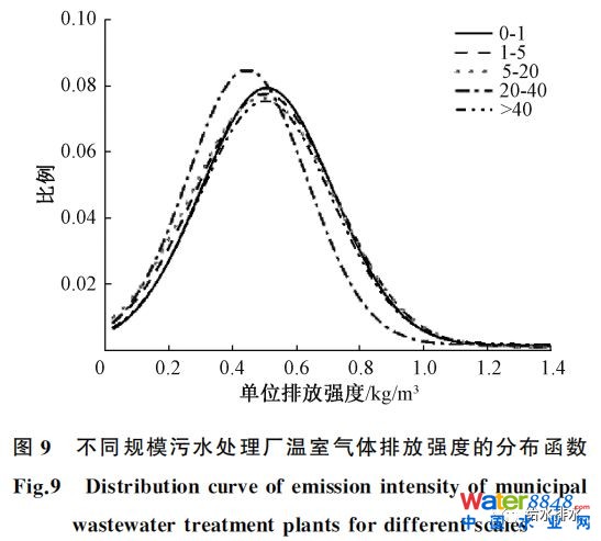 圖9及表3均給出了不同規(guī)模污水處理廠溫室氣體排放強(qiáng)度的差異。為了檢驗(yàn)不同規(guī)模的污水處理廠在排放強(qiáng)度上是否存在差異,本研究進(jìn)行了非參數(shù)Kolmogorov-Smirnov檢驗(yàn)以及Mann-Whitney檢驗(yàn)。檢驗(yàn)結(jié)果表明,不同規(guī)模污水處理廠的溫室氣體排放強(qiáng)度不存在統(tǒng)計(jì)學(xué)上的顯著差異。但是,從均值的計(jì)算結(jié)果來看,規(guī)模越大的污水處理廠,溫室氣體排放強(qiáng)度越低。