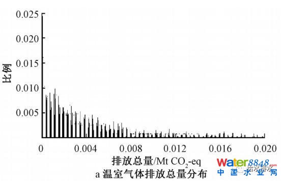 本文以2016年4 298座城鎮(zhèn)污水處理廠作為研究對(duì)象,分析廠級(jí)溫室氣體排放的情況。結(jié)果表明,2016年我國城鎮(zhèn)污水處理廠廠級(jí)溫室氣體排放總量平均為0.007 Mt CO2-eq,其中50%的廠排放總量分布在0.001 Mt CO2-eq至0.008 Mt CO2-eq之間(圖8a)。從單位水排放量來看,2016年我國城鎮(zhèn)污水處理廠廠級(jí)溫室氣體排放強(qiáng)度平均為0612 kg/m3,其中50%的廠排放強(qiáng)度分布在0.300~0.800 kg/m3(圖8b)。