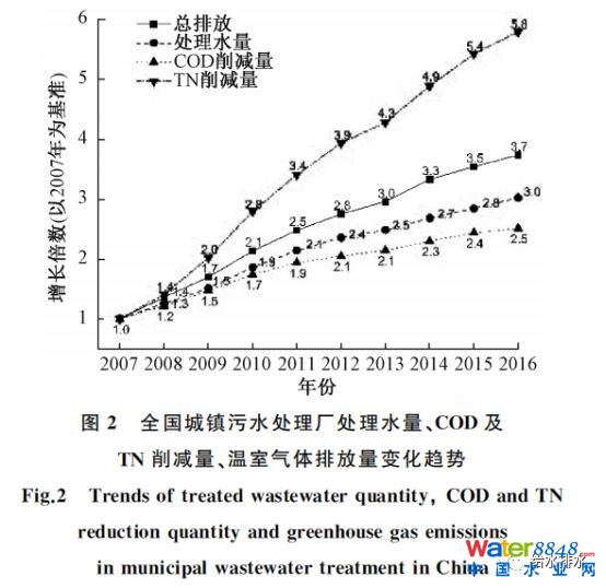 圖2是2007~2016年我國城鎮(zhèn)污水排放總量、處理水量、COD及TN削減量的增長趨勢(shì)。在這10年間,城鎮(zhèn)污水處理總量增長了2倍,溫室氣體排放總量增長了2.7倍,溫室氣體總排放量的增長幅度大于總處理水量的增長幅度。這主要是由于我國城鎮(zhèn)污水處理要求不斷提高,具體來看,過去10年間COD削減量以及TN削減量分別增長了1.5倍以及4.8倍。