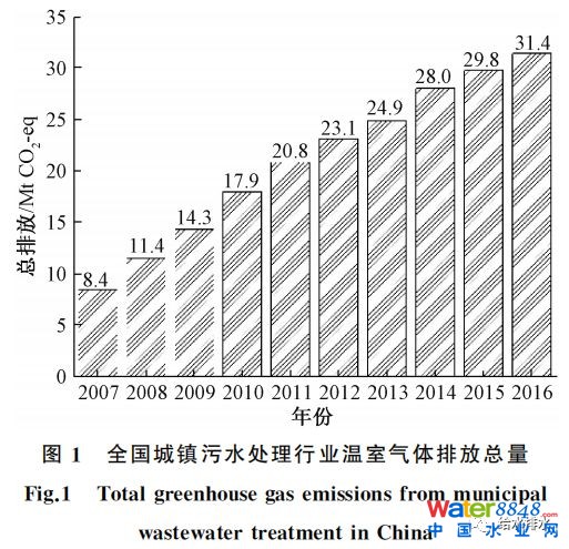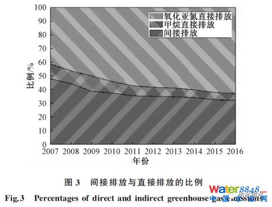 圖1是我國2007~2016年城鎮(zhèn)污水處理廠的溫室氣體排放總量。在這10年間,城鎮(zhèn)污水處理的總排放量從8.4Mt CO2-eq增長至31.4 Mt CO2-eq,增加了2.7倍。