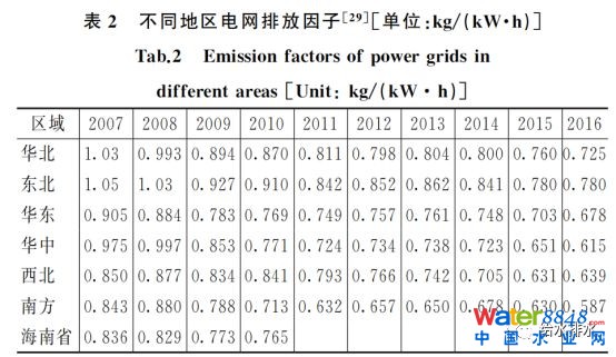 EFCO2,i——第i座污水處理廠電耗的CO2排放因子,不同地區(qū)的取值見表2,kg/kW·h。