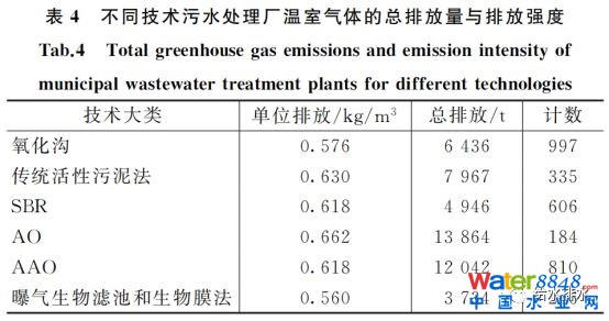 除規(guī)模外,技術(shù)也是影響溫室氣體排放強(qiáng)度的一個(gè)重要因素。圖10及表4給出了氧化溝、傳統(tǒng)活性污泥法、SBR、AO、AAO以及曝氣生物濾池與生物膜法六類技術(shù)的溫室氣體排放情況。通過統(tǒng)計(jì)檢驗(yàn)發(fā)現(xiàn),在0.05的顯著性水平下,氧化溝與SBR、AO、AAO的溫室氣體排放強(qiáng)度,曝氣生物濾池和生物膜法與AO、AAO的溫室氣體排放強(qiáng)度均存在統(tǒng)計(jì)學(xué)上的差異。其中,氧化溝以及曝氣生物濾池和生物膜法都較AO以及AAO具有較低的排放強(qiáng)度。