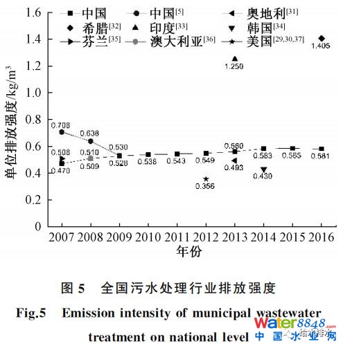 根據(jù)UNFCCC數(shù)據(jù)庫中我國最新的排放數(shù)據(jù),2012年全國溫室氣體排放總量為11 896 Mt CO2-eq,經(jīng)計(jì)算,城鎮(zhèn)污水處理行業(yè)的排放量占到了全國總排放量的0.19%。這個(gè)比例在奧地利約為0.80%,在希臘約為0.90%,在整個(gè)歐洲約為0.45%,在美國約為0.21%,在澳大利亞約為0.36%,在日本約為0.23%。我國城鎮(zhèn)污水處理廠的排放占比略低于發(fā)達(dá)國家,這可能主要和我國鋼鐵、水泥等高排放產(chǎn)業(yè)的比重較大有關(guān)。