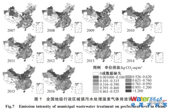圖7是我國城鎮(zhèn)污水處理溫室氣體排放單位排放強(qiáng)度地圖。可以看出,南北方的排放強(qiáng)度存在顯著差異,北方地區(qū)的排放強(qiáng)度顯著高于南方地區(qū),且在10年中一直保持這一趨勢(shì)。北方地區(qū)的排放強(qiáng)度較高的原因可能有如下兩點(diǎn):一是北方地區(qū)污水處理廠進(jìn)水污染物濃度相對(duì)較高,主要由于北方地區(qū)排水系統(tǒng)中雨水、地下水等外來水較少;二是北方地區(qū)污水處理廠的單位水電耗相對(duì)較高,因此間接排放也較高,這主要由于北方地區(qū)平均溫度較低,尤其到了冬季,部分地區(qū)需要通過增加曝氣、保溫等措施來保證微生物效率,因此導(dǎo)致了電耗及溫室氣體排放的增加。