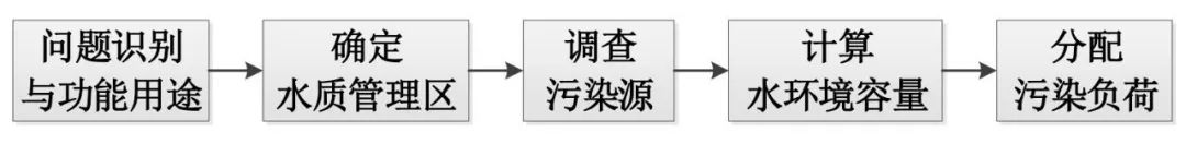 基于“總量控制”的污染物負(fù)荷削減及徑流控制的思路,旨在從水環(huán)境保護(hù)目標(biāo)出發(fā),以受納水體對(duì)某種污染物的最大允許排放量為依據(jù),確定污染物的最大排放負(fù)荷,從而對(duì)污染源進(jìn)行有效管控。TMDL的實(shí)施步驟如下:
