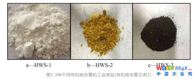由于工業(yè)廢鹽來源眾多,導(dǎo)致其組成成分相對復(fù)雜,表觀性狀亦有差異。圖1為3種來源的廢鹽,表觀白度和性狀明顯不同。劉錚等認為,各行業(yè)產(chǎn)生的廢鹽組分差異大、特征不穩(wěn)定是阻礙其有效處置的主要原因。表2列舉了幾種農(nóng)藥廢鹽的工業(yè)和元素分析數(shù)據(jù)?芍7種廢鹽(HWS-1~HWS-7)中NaCl含量為40%~90%,其他無機物含量為1%~15%,有機物含量為1%~25%。從工業(yè)分析可看出,揮發(fā)分和灰分含量較高,固定碳含量較低。廢鹽中有機物成分大多為難降解有機物,含量差別較大。