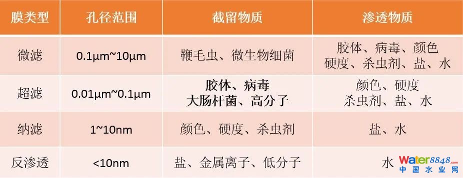 膜按照孔徑分可以分為以下4類,國(guó)內(nèi)外使用的膜生物反應(yīng)器大部分濾膜孔徑集中在0.05-0.4μm之間,基本介于超濾、微濾膜臨界點(diǎn)附近。