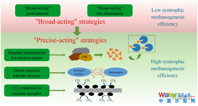 為解決該問題,傳統(tǒng)的研究重點聚焦于對有機廢物性質(zhì)的優(yōu)化和生物刺激。一方面,采用多種預(yù)處理方法來增強復(fù)雜有機廢物的增溶和轉(zhuǎn)化。另一方面,通過生物刺激提高關(guān)鍵酶活性和緩解抑制效應(yīng),以增強產(chǎn)甲烷菌的代謝能力。然而,傳統(tǒng)的預(yù)處理方法只能在一定程度上增強有機廢物的增溶和水解,無法精準(zhǔn)地為產(chǎn)甲烷提供合適的底物。常用的生物刺激策略也不能精準(zhǔn)刺激產(chǎn)甲烷菌的代謝。更糟糕的是,預(yù)處理后氨氮等代謝物的濃度會顯著增加,這將加劇對產(chǎn)甲烷菌活性的抑制。另外,在某些情況下,預(yù)處理過程中的物理和/或化學(xué)反應(yīng)會產(chǎn)生新的難降解物質(zhì),這將進一步降低有機物轉(zhuǎn)化率和甲烷產(chǎn)量。因此,預(yù)處理方法和生物刺激這些提升產(chǎn)甲烷效率的“廣泛作用”策略對整個厭氧系統(tǒng)都有影響,不能有針對性地直接促進產(chǎn)甲烷過程。為了克服傳統(tǒng)方法的瓶頸,需要進一步開發(fā)“精準(zhǔn)作用”策略,即潛在的有針對性的產(chǎn)甲烷強化方法。