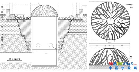 生態(tài)滯留草溝末端設(shè)置溢流式雨水口,雨水口入口標(biāo)高高于透水土壤表面底部15cm。溢流雨水口采用國(guó)標(biāo)圓形檢查井,與過(guò)路雨水橫管相連。
