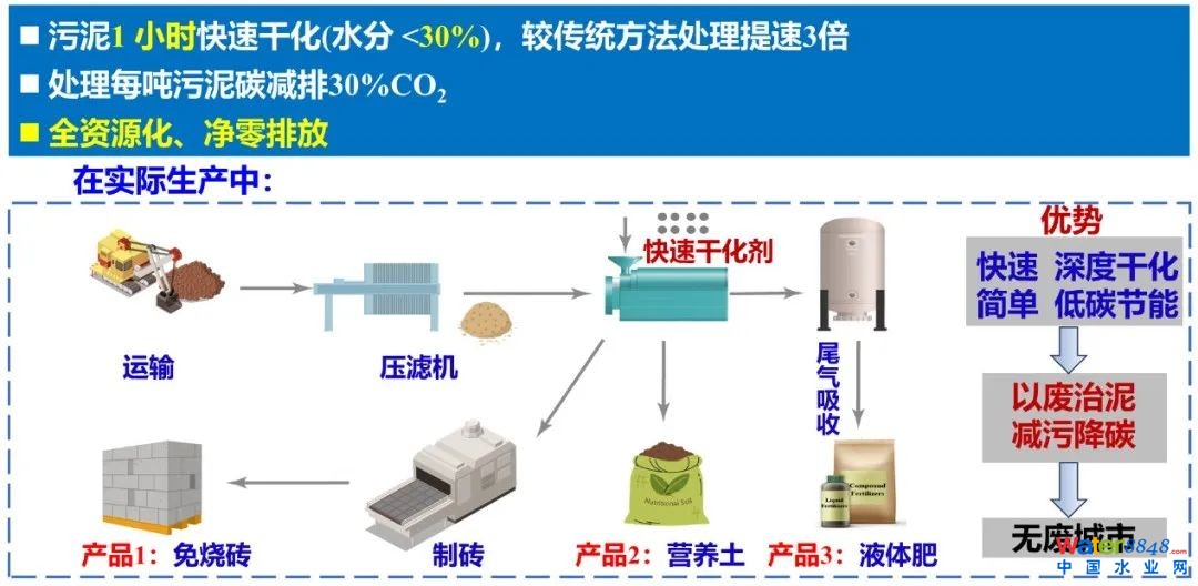 這種污泥干化“神器”是如何工作的呢?據(jù)團(tuán)隊(duì)負(fù)責(zé)人、東華大學(xué)環(huán)境科學(xué)與工程學(xué)院2022級(jí)博士生孔祥海介紹,干化劑按一定比例添加到污泥中可與水分和有機(jī)質(zhì)發(fā)生反應(yīng),并快速放熱,2分鐘使污泥快速升溫至100-125攝氏度,1小時(shí)將污泥含水量從70-80%降至20-30%,重量和體積減少30%以上,產(chǎn)物可用作混凝土填料或燃料。除了快速降低污泥的含水量,污泥干化技術(shù)還能有效鈍化污泥中的重金屬(有效態(tài)重金屬降低90%以上),消除污泥中的激素、抗生素、有害菌等污染物(三害消除95%以上),實(shí)現(xiàn)同步無(wú)害化,促進(jìn)金屬?gòu)U渣危廢和污泥處理產(chǎn)業(yè)集約化、智能化、裝備化和綠色化。此外,干化后的污泥還可以制備成免燒磚和營(yíng)養(yǎng)土,干化過(guò)程中產(chǎn)生的尾氣吸收后可做液體肥,實(shí)現(xiàn)資源化利用。