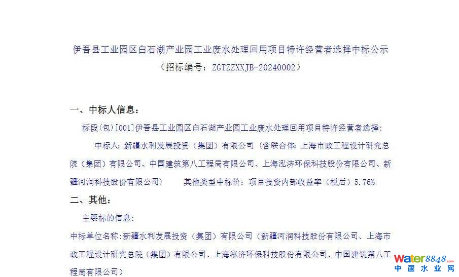 (1)中標人:新疆水利發(fā)展投資(集團)有限公司(新疆河潤科技股份有限公司、上海市政工程設計研究總院(集團)有限公司、上海泓濟環(huán)保科技股份有限公司、中國建筑第八工程局有限公司)