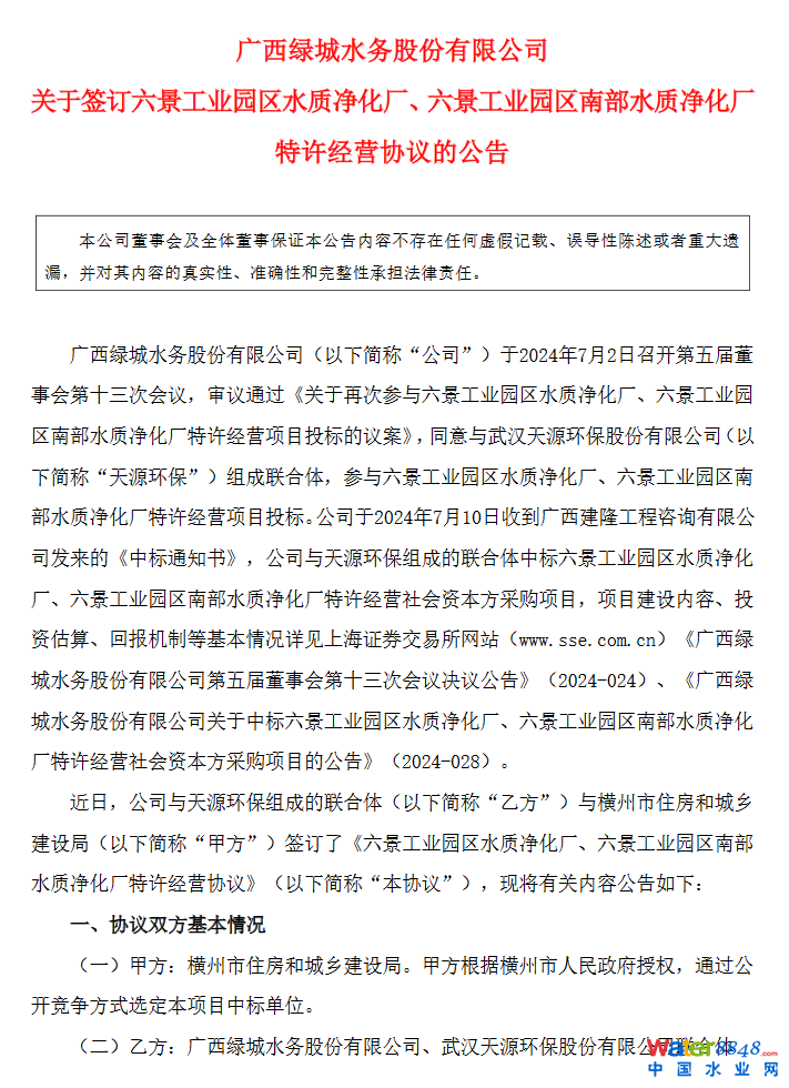 北極星水處理網(wǎng)獲悉,綠城水務公布,近日,公司與天源環(huán)保組成的聯(lián)合體(以下簡稱“乙方”)與橫州市住房和城鄉(xiāng)建設局(以下簡稱“甲方”)簽訂了《六景工業(yè)園區(qū)水質(zhì)凈化廠、六景工業(yè)園區(qū)南部水質(zhì)凈化廠特許經(jīng)營協(xié)議》。