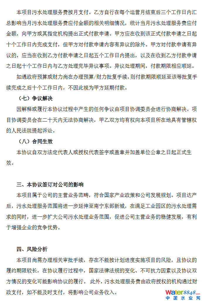綠城水務:簽訂六景工業(yè)園區(qū)水質(zhì)凈化廠、六景工業(yè)園區(qū)南部水質(zhì)凈化廠特許經(jīng)營協(xié)議