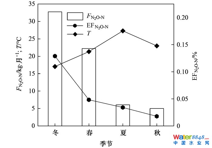 季節(jié)不但對污水處理廠的運(yùn)行效果和運(yùn)行參數(shù)等產(chǎn)生影響, 而且會影響污水處理廠N2O產(chǎn)生與排放, 其中冬季與夏季會有較大差異.