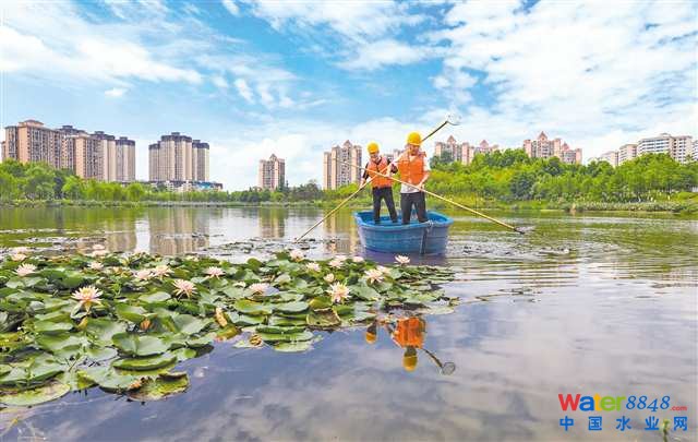 墊江縣牡丹湖濕地公園,藍(lán)天白云倒映在湖面上美如畫,清漂工人在清漂守護(hù)碧水。(攝于2024年5月21日)。通訊員 龔長浩 攝/視覺重慶