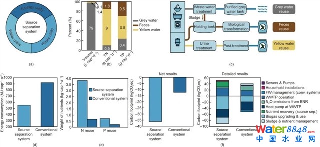 DWS 的建設(shè)為污水源頭分離奠定了基礎(chǔ)。源分離需要多領(lǐng)域與部門配合,可促進能源回收、水處理及廢物利用等領(lǐng)域合作。通過分析灰水、黃水以及糞便的體積、總氮(TN)和總磷(TP)分布,能發(fā)現(xiàn)源分離具有極大的資源回收潛力;宜倮每尚纬稍偕,黃水與糞便回收可用于肥料生產(chǎn)。相較于傳統(tǒng)集中式水系統(tǒng),源分離簡化了水質(zhì)復(fù)雜性,降低了后續(xù)水處理的能耗和碳排放,同時促進了水中氮、磷資源的回收。