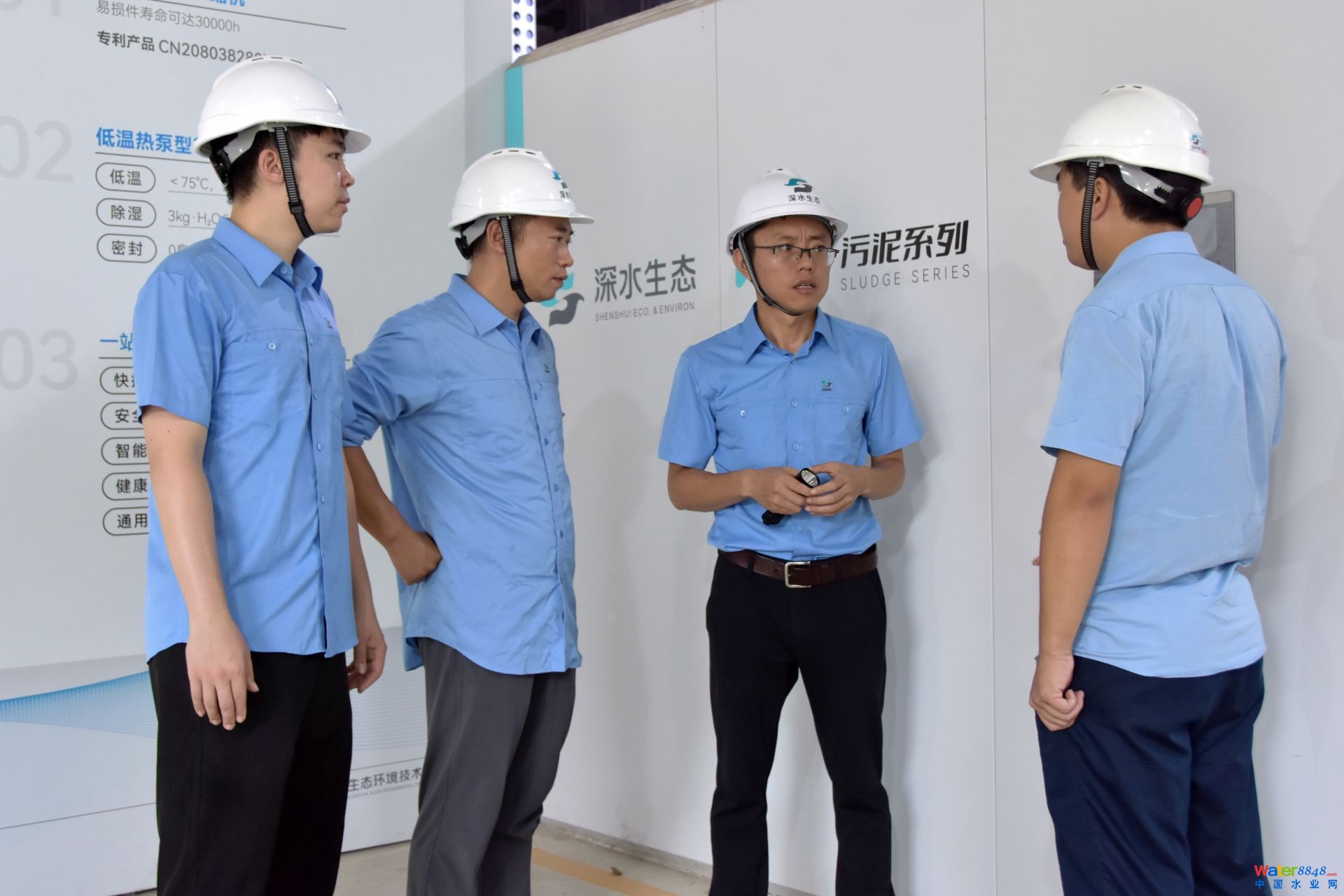孔云華(右二)在深水生態(tài)福田污泥擴(kuò)能項(xiàng)目了解低溫帶式干化機(jī)生產(chǎn)情況。