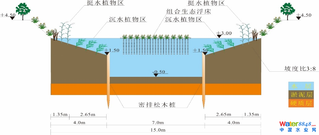 新型強(qiáng)化復(fù)合人工濕地工藝總停留時間3d,總水力負(fù)荷0.15m3//d,出水達(dá)到地表III類標(biāo)準(zhǔn)(GB3838-2002)。