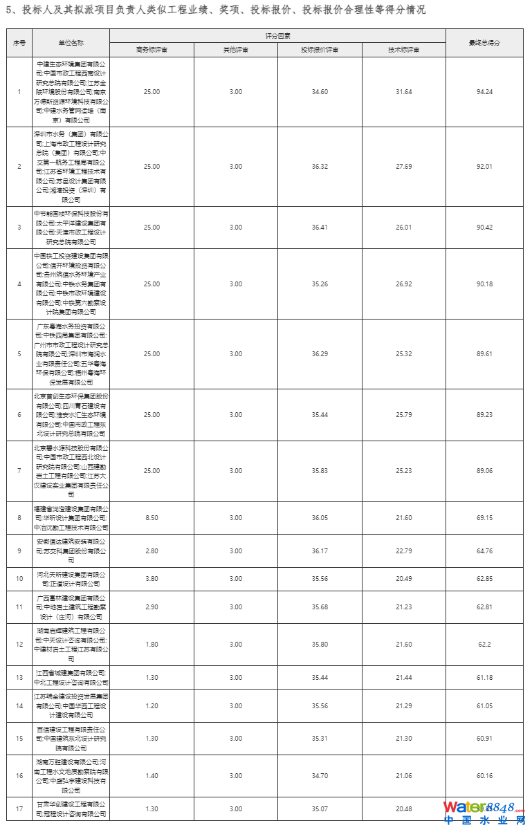 中標(biāo)候選人名稱:深圳市水務(wù)(集團)有限公司、上海市政工程設(shè)計研究總院(集團)有限公司、中交第一航務(wù)工程局有限公司、江蘇省環(huán)境工程技術(shù)有限公司、蘇邑設(shè)計集團有限公司、湘港投資(深圳)有限公司;